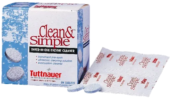 Clean&Simple is an ultrasonic/enzymatic solution dispensed in a unique tablet form. Drop 2 tablets into your ultrasonic tank already filled with water and the tablets will dissolve in about a minute. This is a non-ionic solution which is non-corrosive, non-toxic, biodegradable and non-caustic. Available in boxes of 64 tablets and 144 tablets.